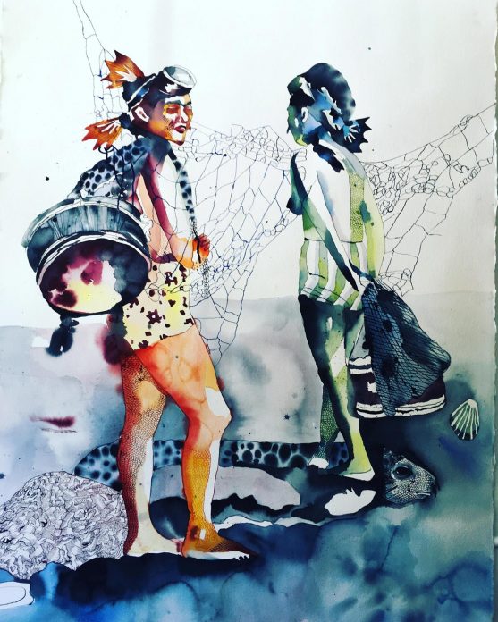 Her paintings depict figments of black soil, thunderstorms, green flats, and hills overlaid with passages of meticulously sculpted fibres of paint. Growing up with three generations under the one roof on Country for half of her childhood, Jaque Vasquez captures unique memories of matriarchal stories, and the gentle resilience bundled in her grandmother’s bag and basket of the last three generations.