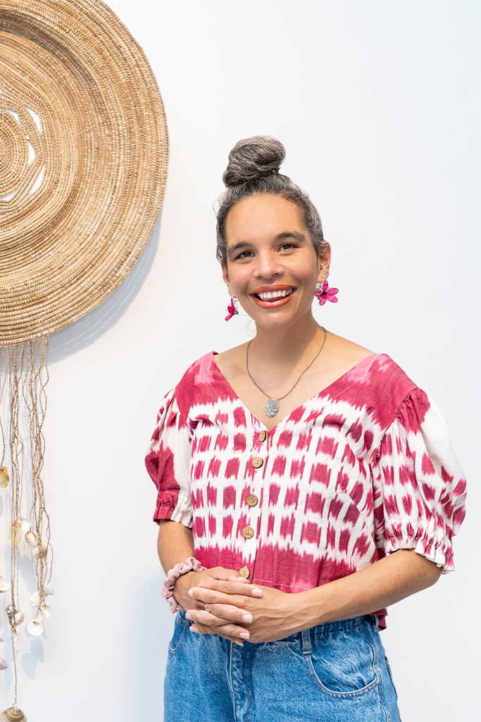 As an artist, her practice draws on Ancestral knowledge, matrilineal connections, memories of place and relationships with Country. Elisa and her mother, Sonja, have collaboratively been at the forefront of gathering knowledge, learning, and experimenting, to revitalise the unique traditional practice of Quandamookaweaving and explore its creative applications to contemporary fibre art. Elisa further develops her practice through both new techniques and materials, acknowledging, nurturing, and protecting her culture and the resources of Quandamooka Country. Her regular inclusion in national survey exhibitions and major prizes demonstrates her conceptual explorations through weaving, sculptural materials, cyanotypes and now printmaking.