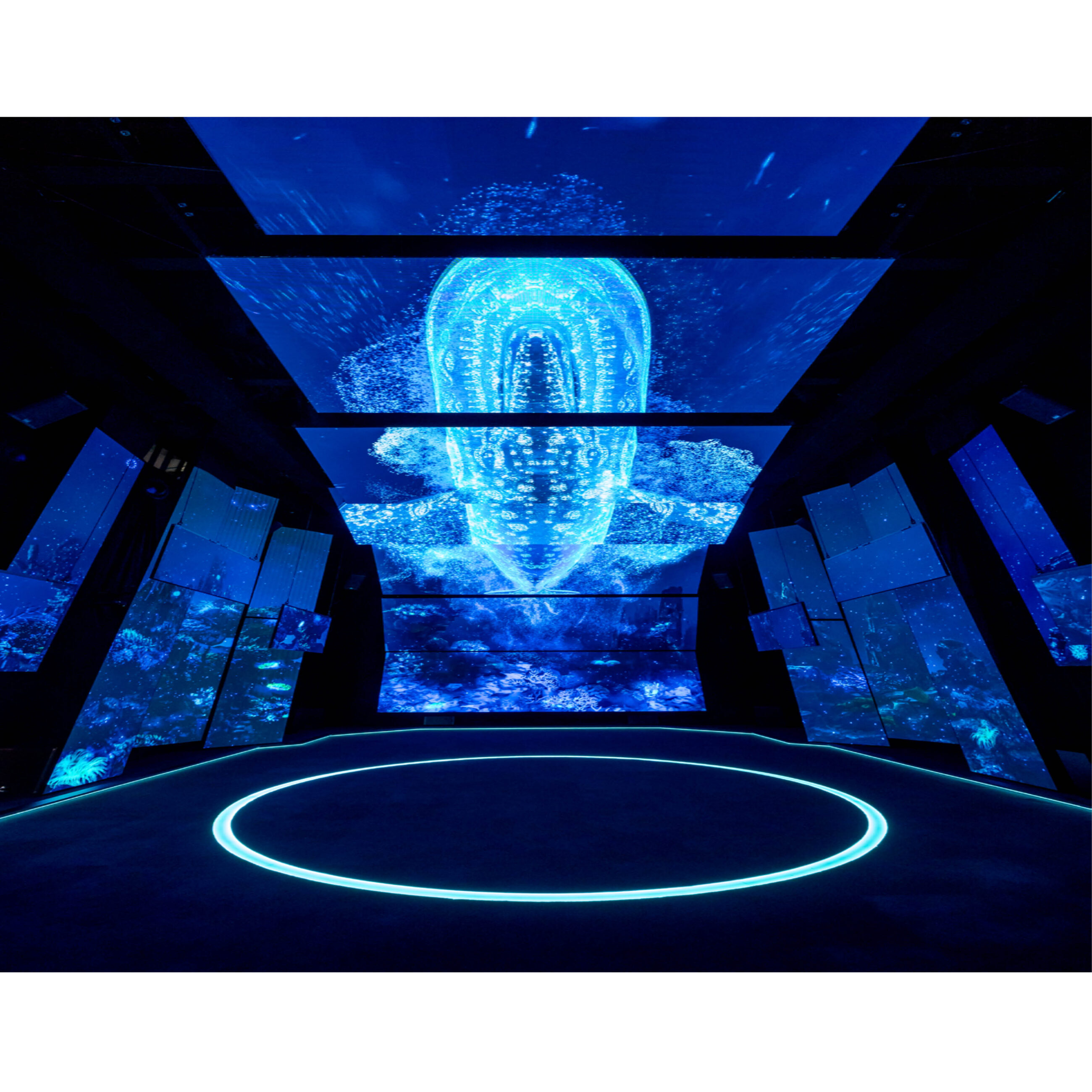 The Sea Country environment features the Pavillion’s largest installation where Brian Robinson’s ‘Uruy Dhangadh’ and ‘Minaral patterning’ are projected onto sea creatures, brought to life by animation from Spinifex Group. In this installation, Robinson transposes the marine environment and ancestral stories of Waiben (Thursday Island) onto a global stage.