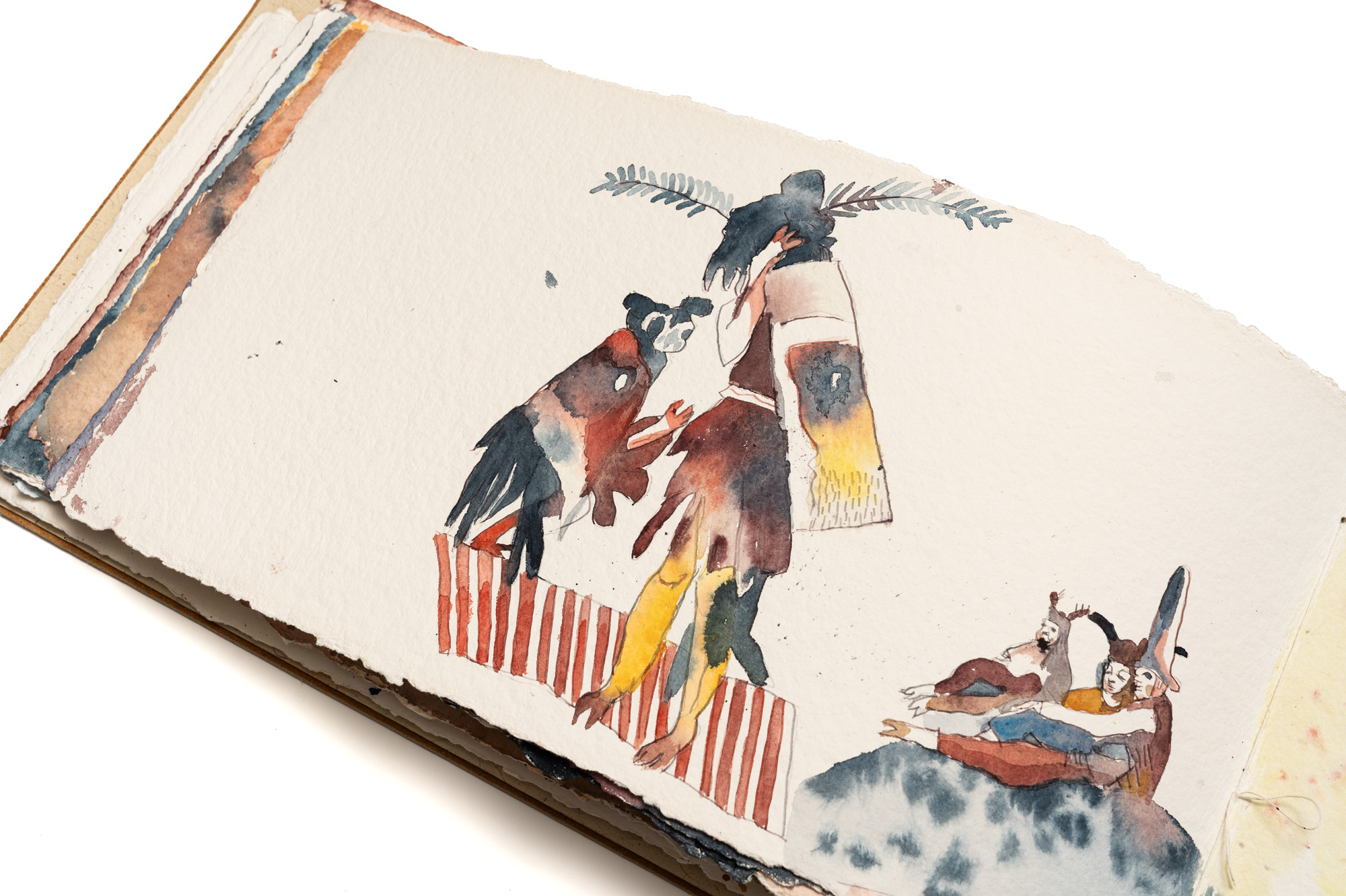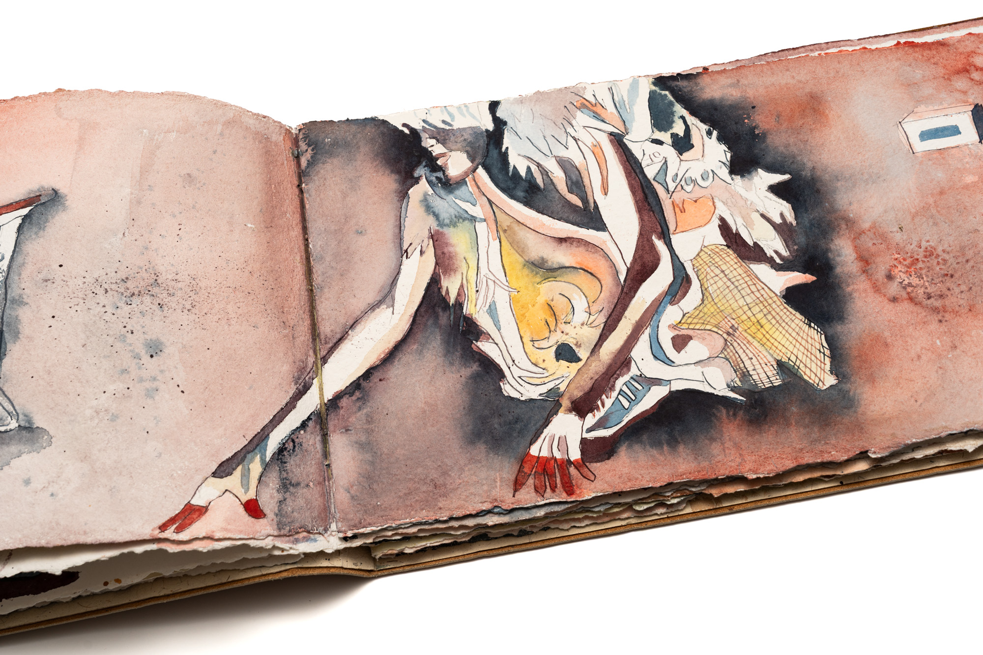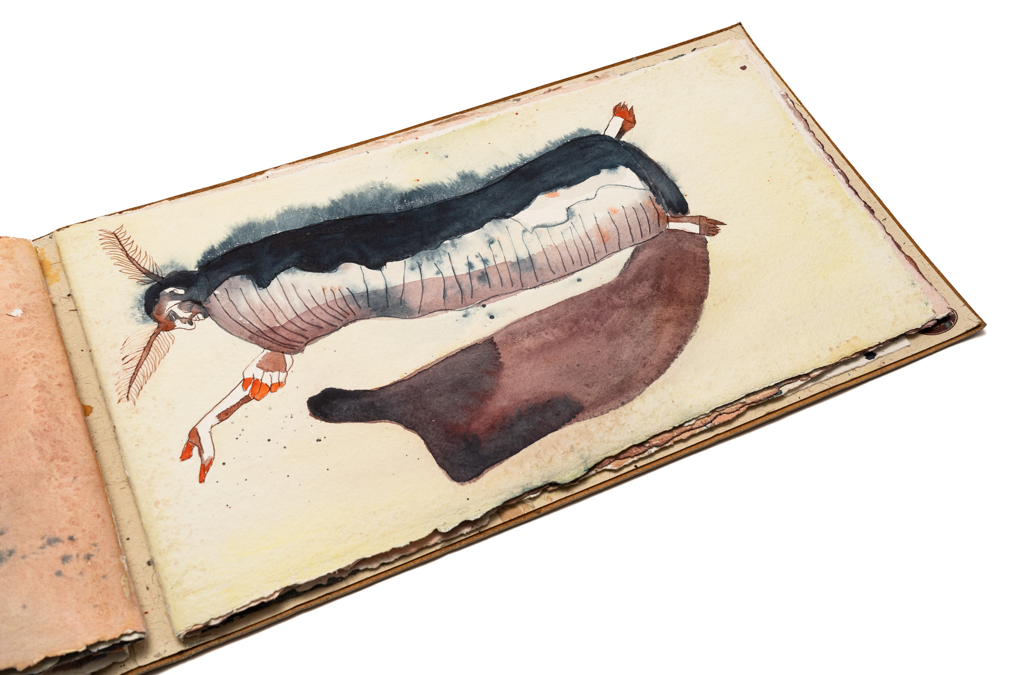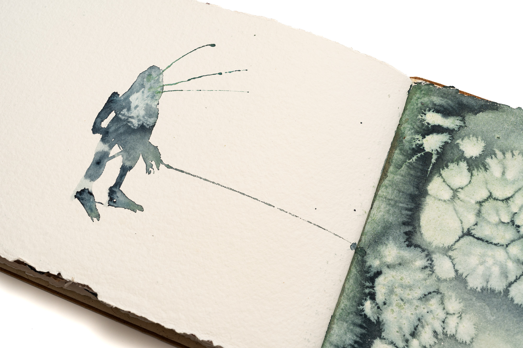 Tales from the In-Between continues Porter’s long-standing collaborative practice through Rhizomes, a hand-painted photographic series created with Billie Wilson-Coffey and performer Bridie Hooper. These large-scale images merge Wilson-Coffey’s luminous photography with Porter’s assemblage costumes, transforming the female form into an organic, hybrid entity. Ink washes, watercolour, and stitched lines blur the boundaries between painting and photography, suggesting roots, veins, and mutations. Synthetic hair and faux fur push the body beyond the frame as Hooper appears against surreal blue skies. A new video with Thomas Oliver expands this dream-like world, exploring layered bodies and evolving cross-species forms.