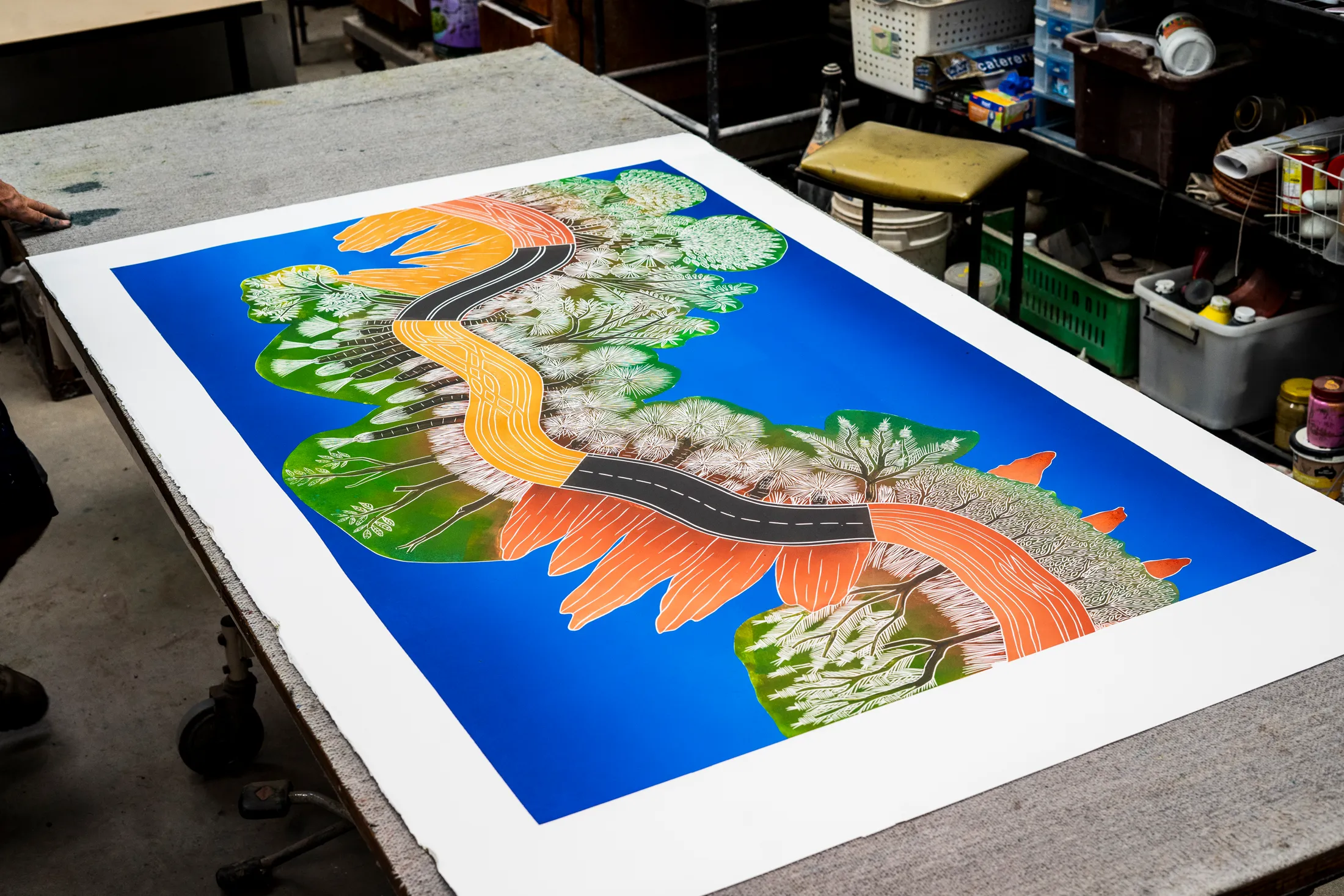 Essay writer, Shonae Hobson states that, “Middle World is a spiritual metaphor that speaks to how First Nations people understand and interact with Country. The exhibition is deeply rooted in themes of cultural memory, connection to place, and the intimate, interwoven stories that are passed down by family and community. In Middle World, Ropeyarn draws from his childhood memories of travelling across the Peninsula Development Road (PDR) in Cape York. Stretching an expansive 571 kilometres from Lakeland to the tip of Australia, the PDR remains one of Australia’s last great wilderness tracks.”