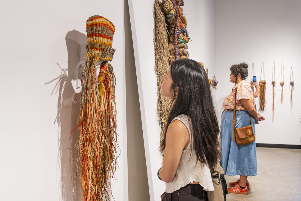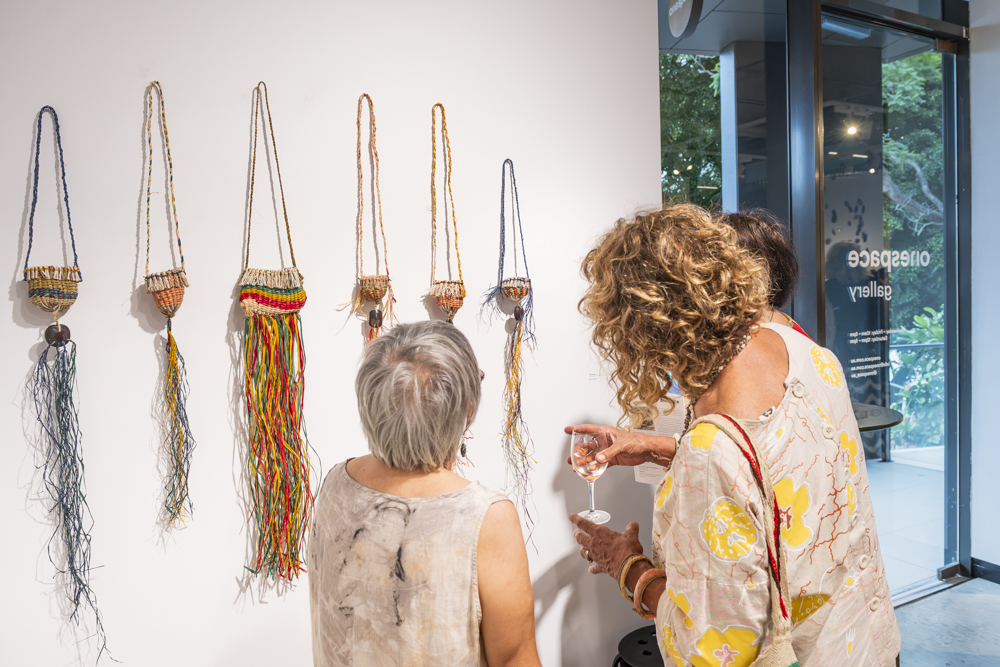 Onespace proudly presents The Grass Tides, an exhibition by Paula Savage in the Main Gallery. This exhibition, featuring several woven pieces and works on paper is Savage’s second exhibition with Onespace gallery, the first being in 2022 alongside Fiona Mosby. Growing up on Moa Island working the lugger boats with her father and brothers, and with little time to sit around with the old Akas (Aunties), she learned the ‘one twist’ weaving method herself, through careful observation rather than direct instruction. It remains a constant in her life today. These are the main threads in the weave of Savage’s creative output. The prints and weavings presented are a selection of works that mark her development as a senior artist at Moa Arts and a creative force at the top of her game.