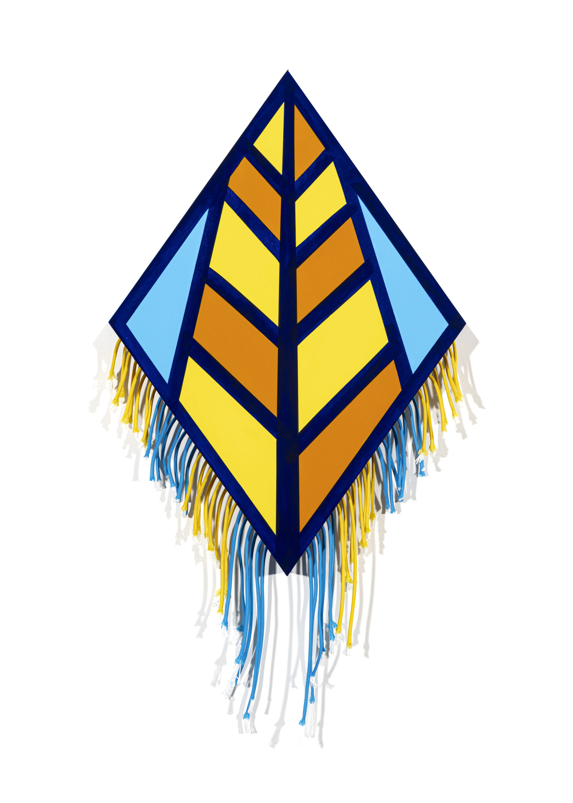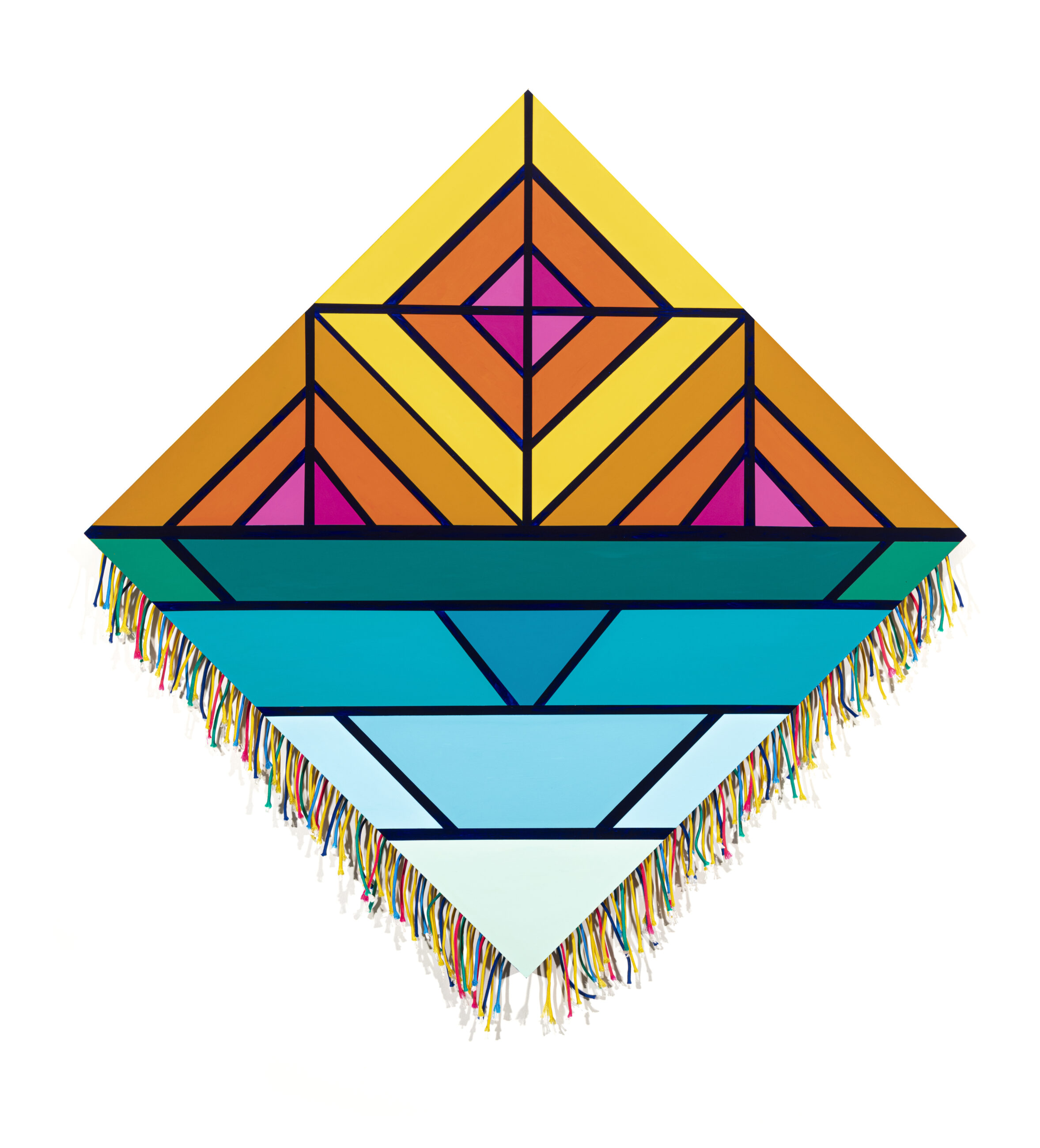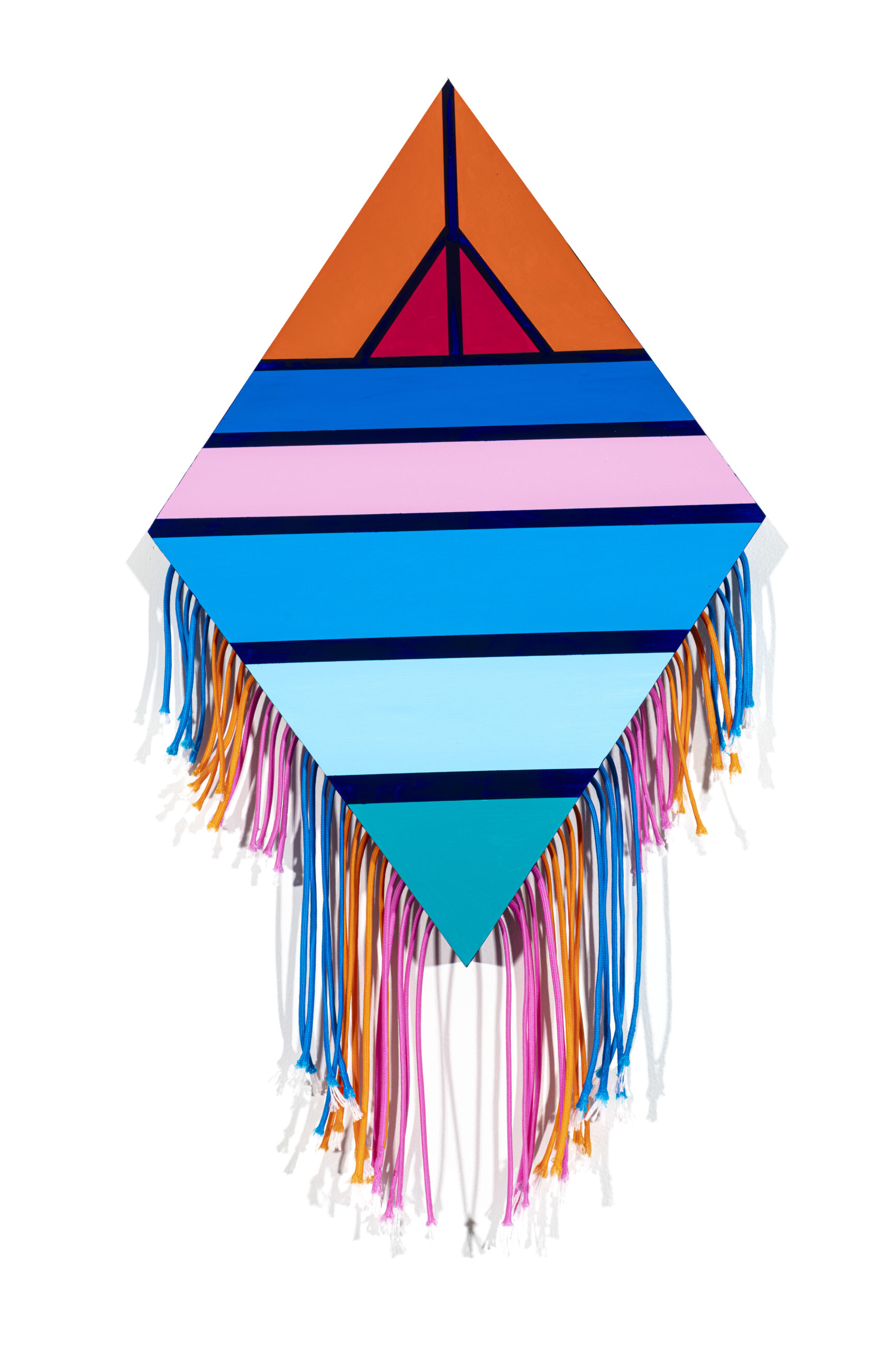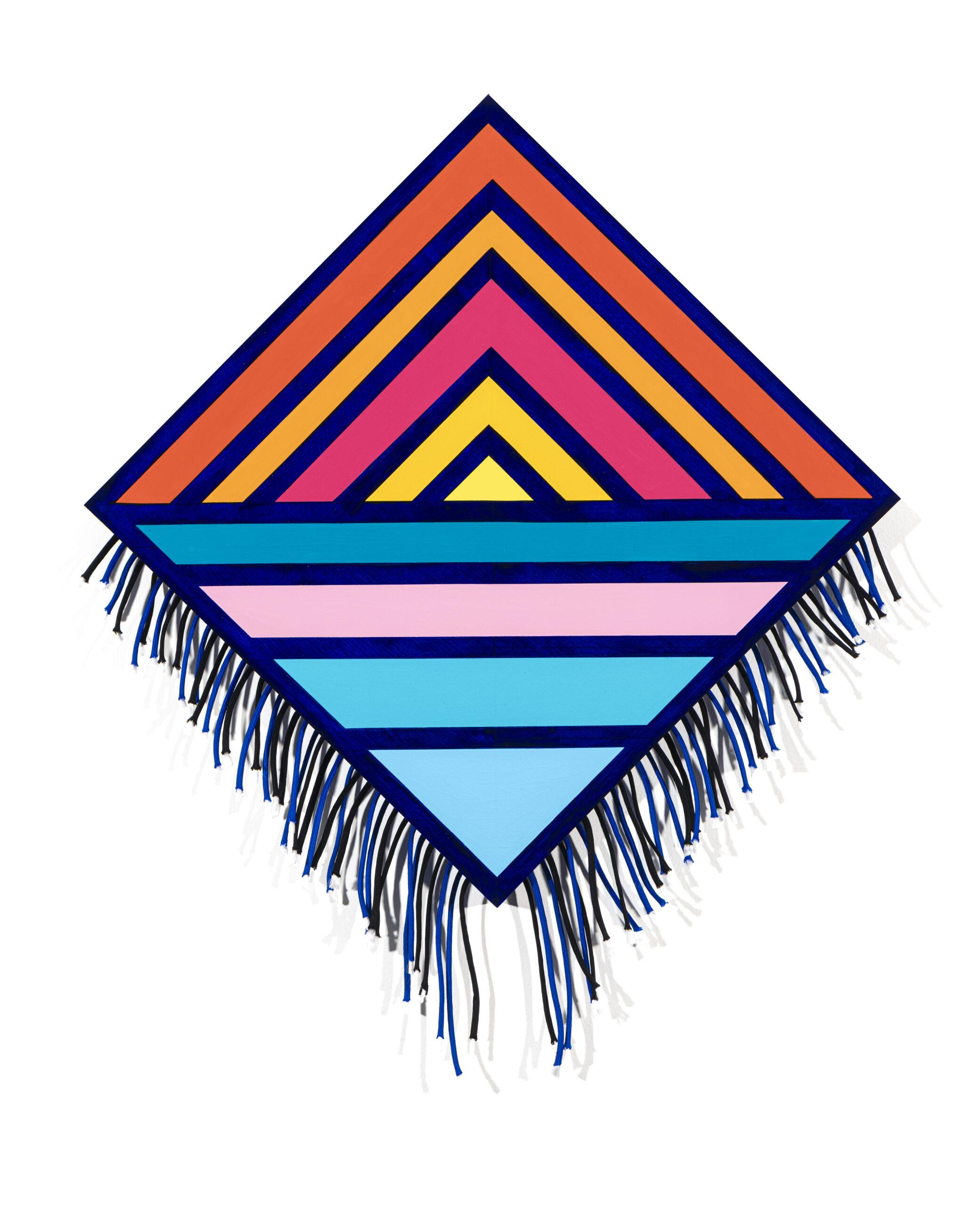 In Lanu Lanu: The Colour of Language, Samuel Tupou extends upon his ongoing dialogue with Tongan heritage, language, and migration through the lens of colourful abstraction. Engaging colour as a universal mode of communication, Tupou reinterprets the structural motifs of tapa cloth, tattoo, and Lapita pottery into compositions that balance intuition and formal precision. His vivid geometries chart a space between cultural memory and modernist inquiry, revealing abstraction as both a site of displacement and reconnection. Essay writer David Broker, states that, “Lanu Lanu: The Colour of Language is the result of the twists and turns that artists who have multicultural influences might experience over a lifetime”. The hanging fringes, inspired by the brightly coloured threads of Tongan fala mats, articulate a point of cultural convergence where natural fibre meets synthetic material and tradition meets adaptation. In this body of work, Tupou transforms inherited forms into a contemporary visual language that speaks to resilience, hybridity, and the evolving nature of Pacific identity.