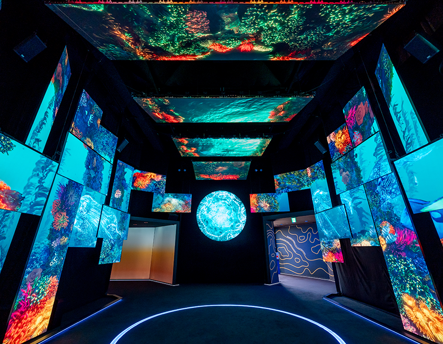 The Sea Country environment features the Pavillion’s largest installation where Brian Robinson’s Uruy Dhangadh and Minaral patterning are projected onto sea creatures, brought to life by animation from Spinifex Group. In this installation, Robinson transposes the marine environment and ancestral stories of Waiben (Thursday Island) onto a global stage.