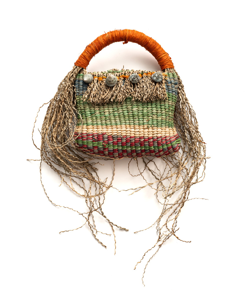 Woven basket, raffia, seagrass chord, shells