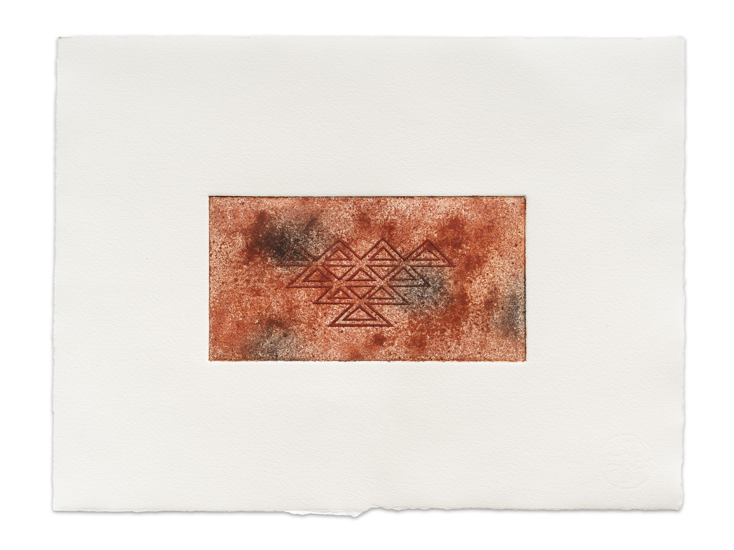 Print pulled from soft ground zinc plate impressed with soil. Intaglio pulled a la poupee print on Hahnemuhle Weiss 300gsm paper using Charbonnel ink.