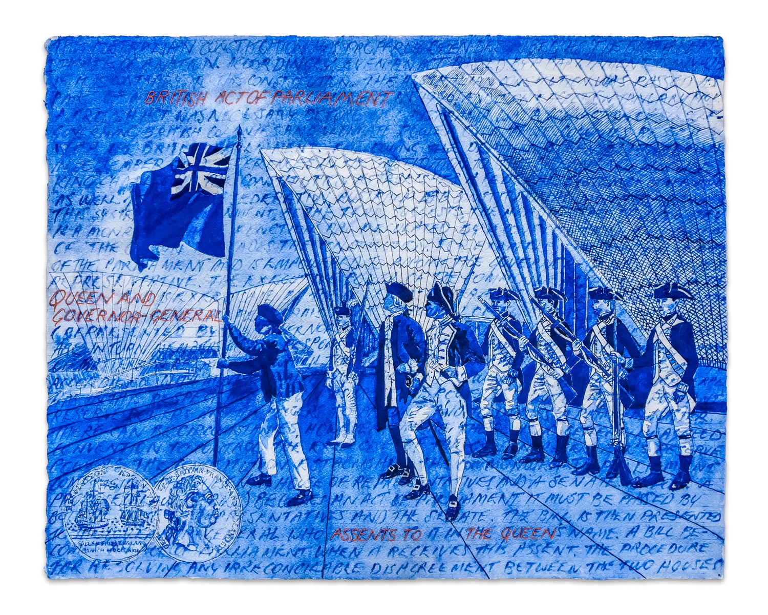 Digital print on Twill Waratah fabric, hand stitched blended yarn in blue felt boarder