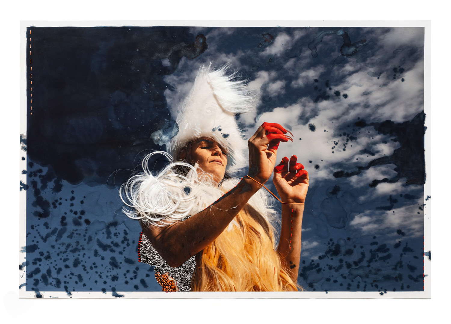 Digital photograph on Rag Aquerelle, ink, embroidery thread, pencil, paint pen, watercolour, synthetic hair, fur and fabric